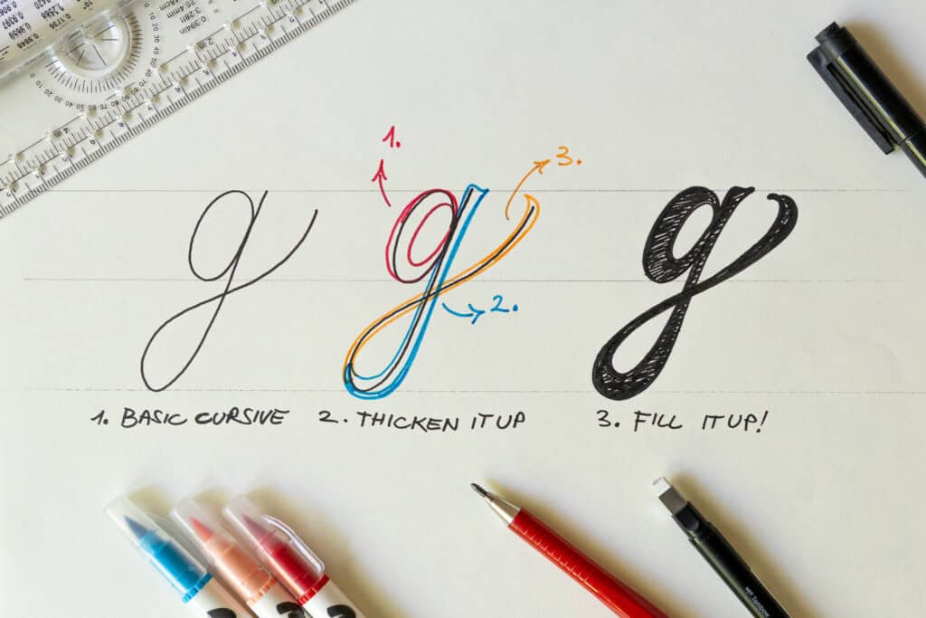 Script lettering is a bit more challenging for beginners, but if you remember this one rule, you’ll make your life easier: Upstrokes are thin, Downstrokes are thick.