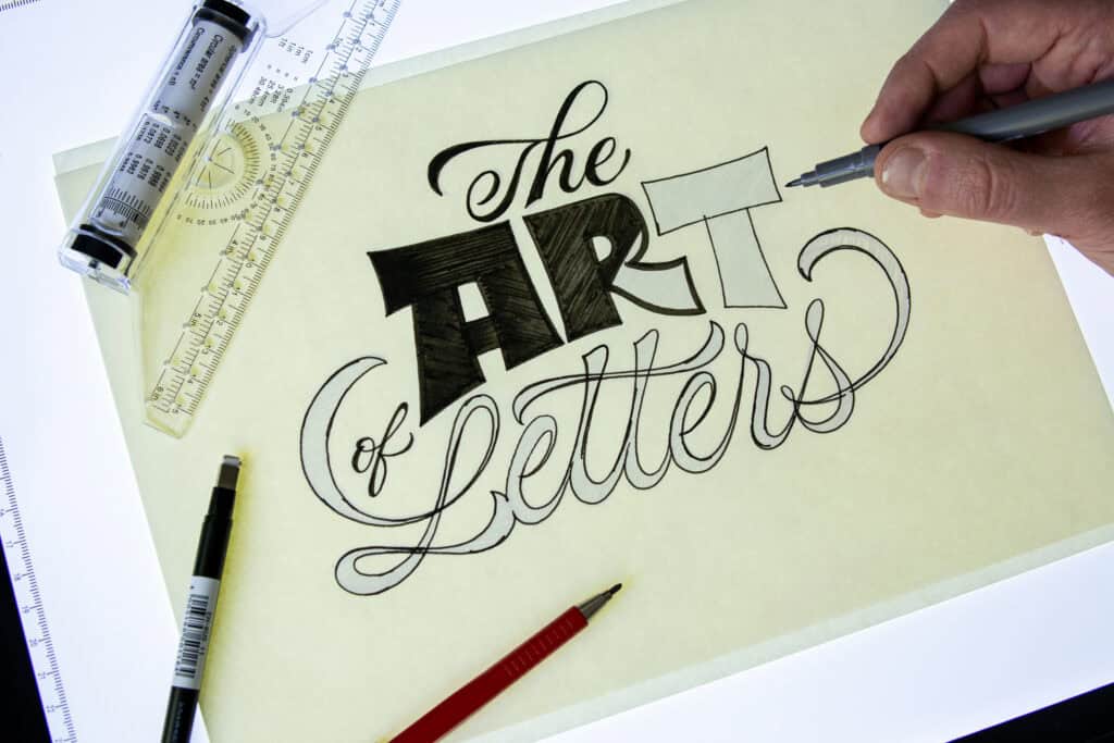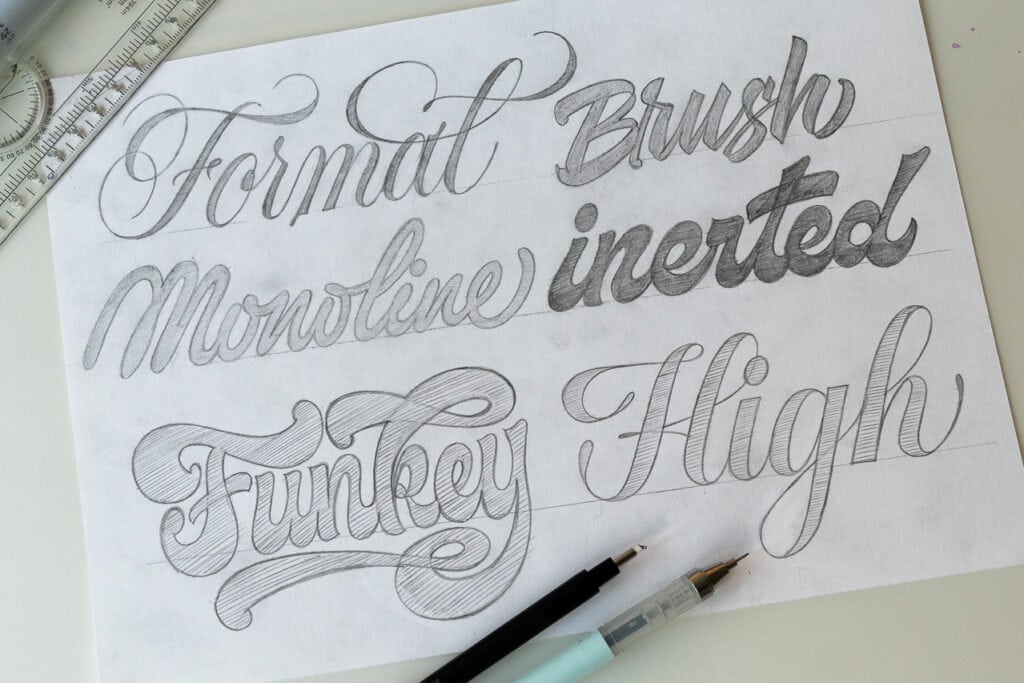 Hand lettering tools and materials on a workspace.