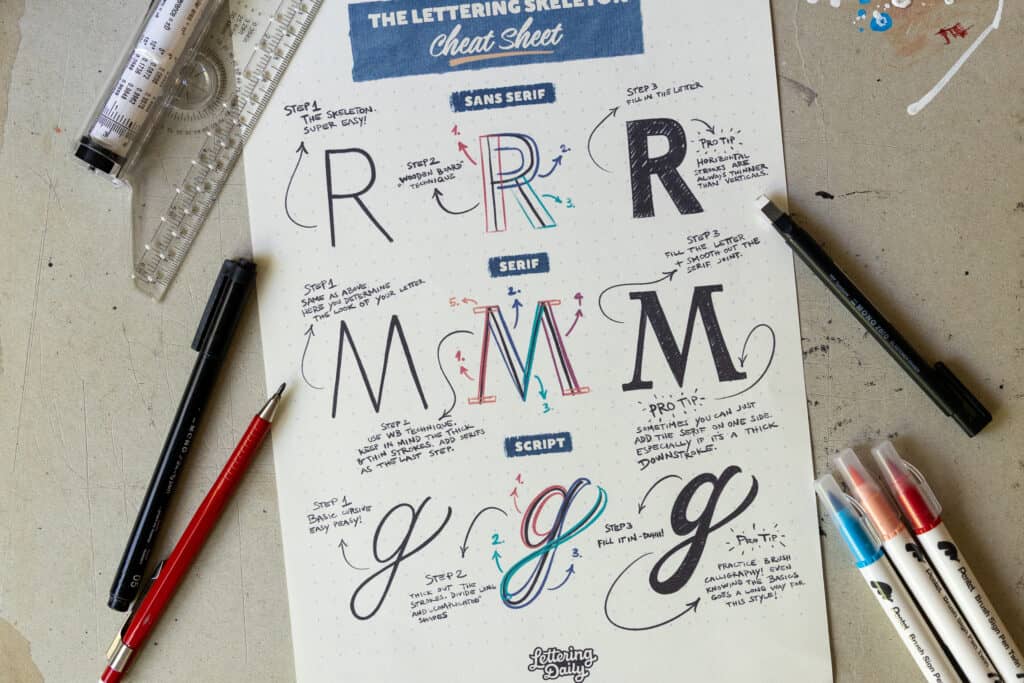 • The Lettering Skeleton Cheatsheet: A visual breakdown showing how to add thickness to your skeletons.